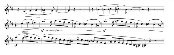 但这里什么连线都没有的情况下,演奏者会自动使用分弓的方式。这就是此处值得思考的一点,虽然缺失了弓法的标记,但有时音乐的形象会自动体现出弓法的类型。
